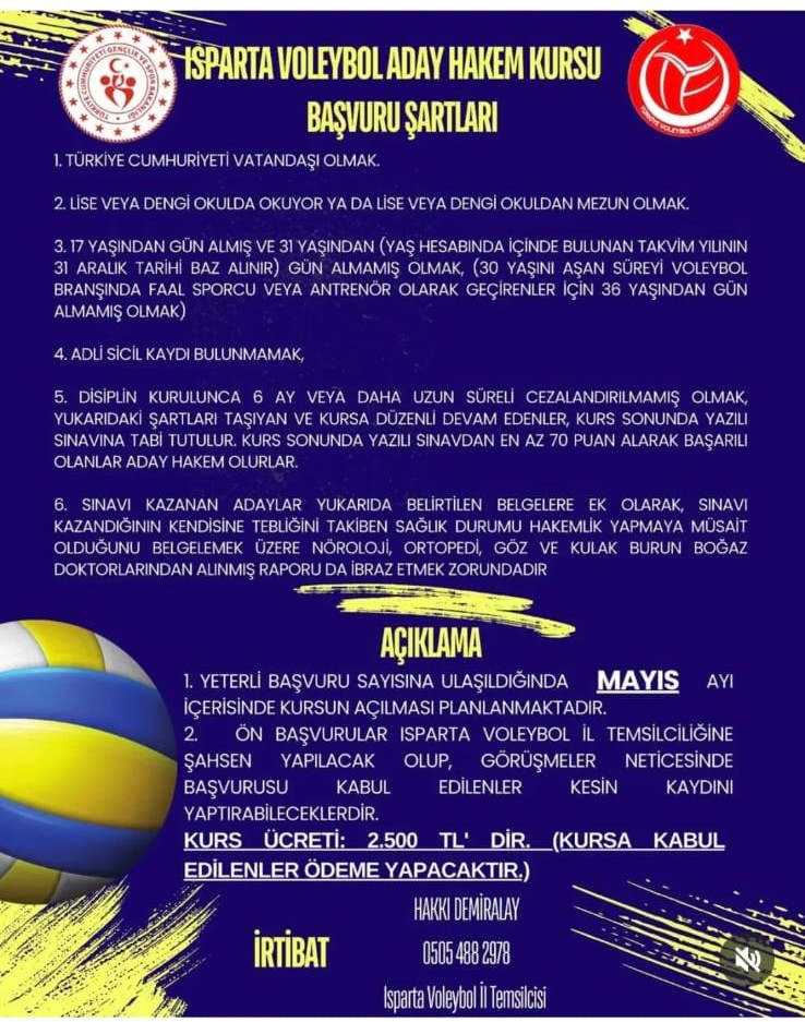 Aday hakem kursu için öncelikle Isparta Voleybol İl Temsilciliğine ön başvuru yapılacaktır. Başvurusu uygun görülen adaylara bilgi verilecektir.