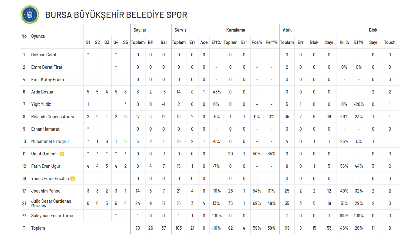 BURSA BÜYÜKŞEHİR BELEDİYESPOR: Yiğit Yıldız, Cepeda, Panou, Fatih Eren Uğur, Arda Bostan, Cardenas ( Umut Özdemir (L), Muhammet Ertuğrul , Gökhan Çatal, Erhan Hamarat, Emre Berat Fırat, Süleyman Ensar Turna)