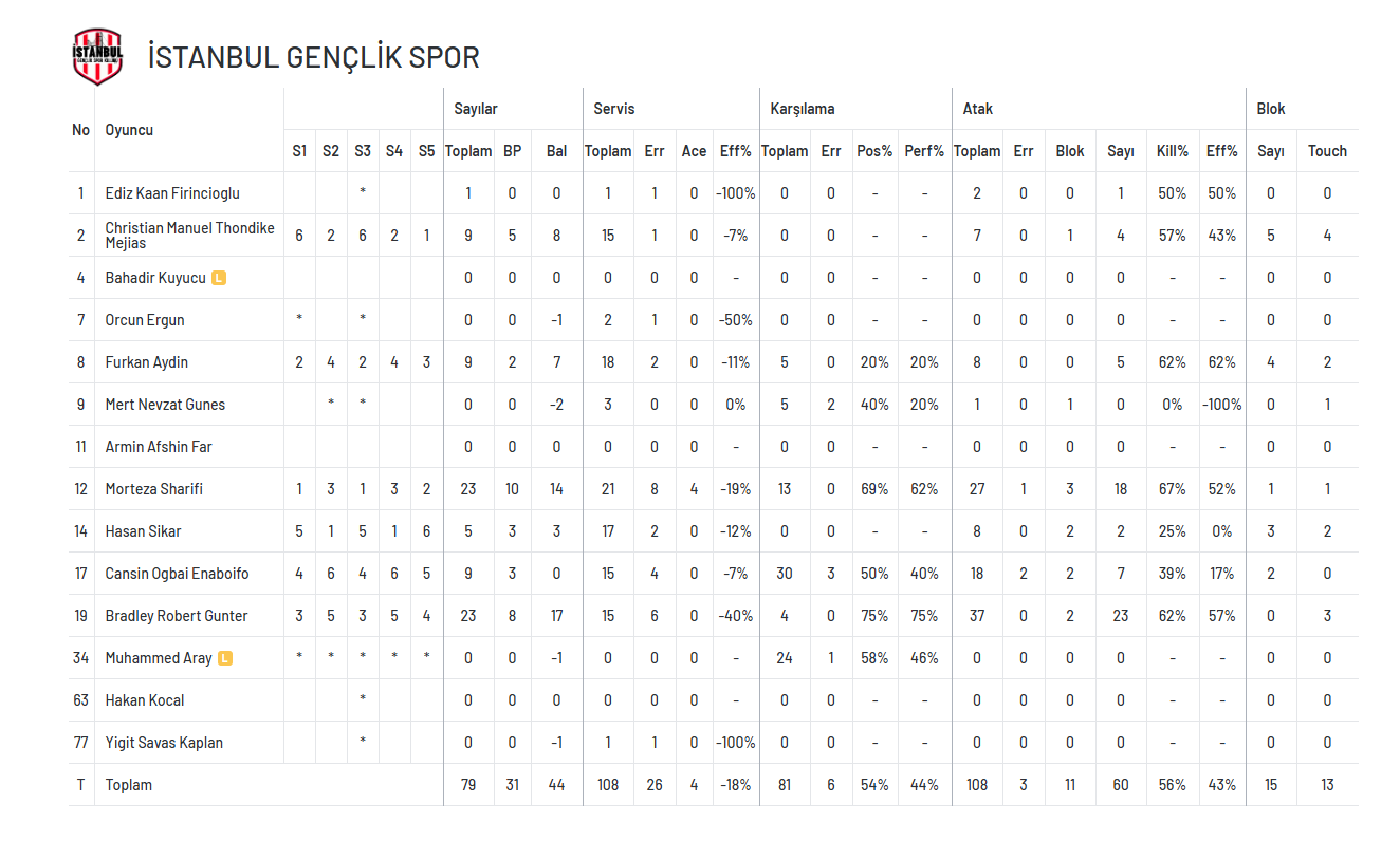 İSTANBUL GENÇLİK SPOR: Sharifi, Yiğit Savaş Kaplan, Bradley Gunter, Cansın Enaboifo, Hakan Sıkar, Mejias (Bahadır Kuyucu (L), Muhammed Aray (L), Orçun Ergün, Mert Nevzat Güneş, Ediz Kaan Fırıncıoğlu)