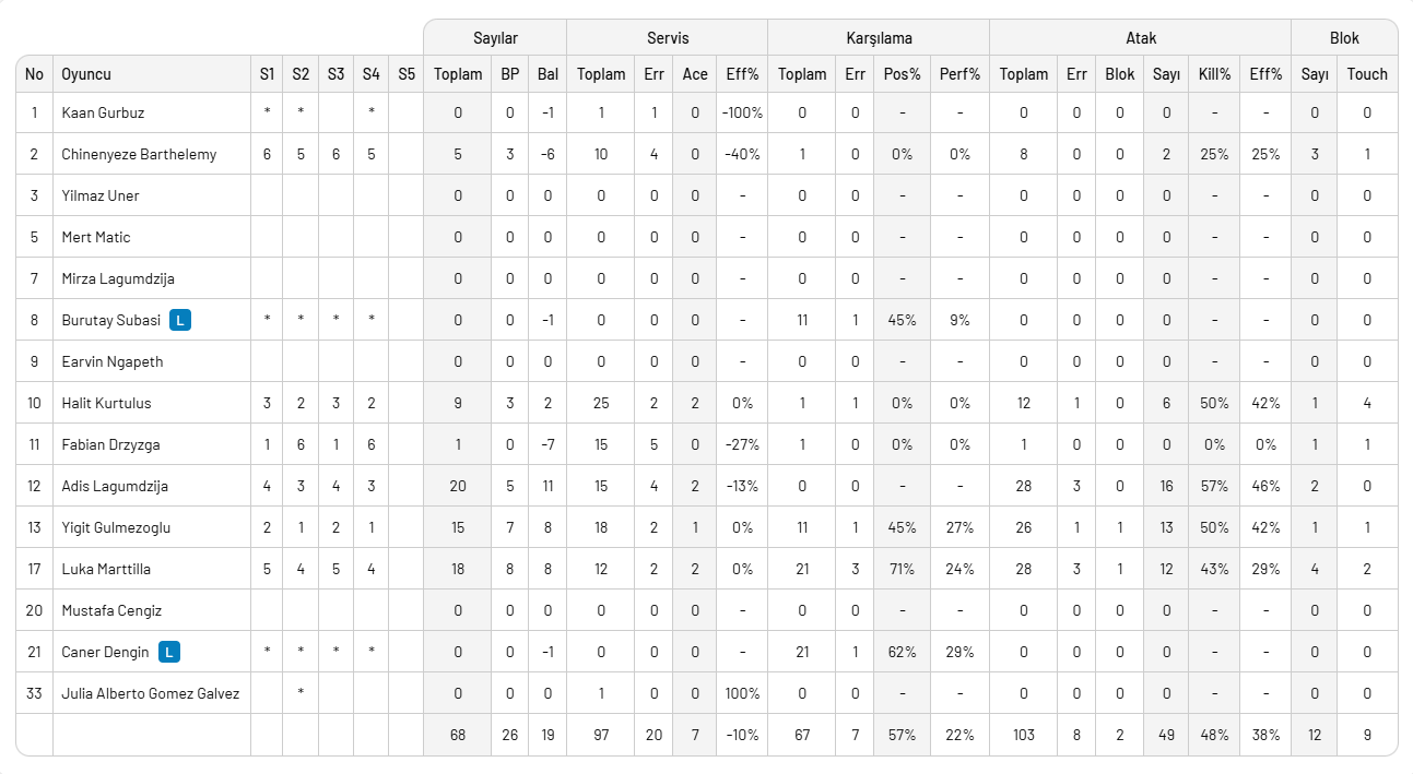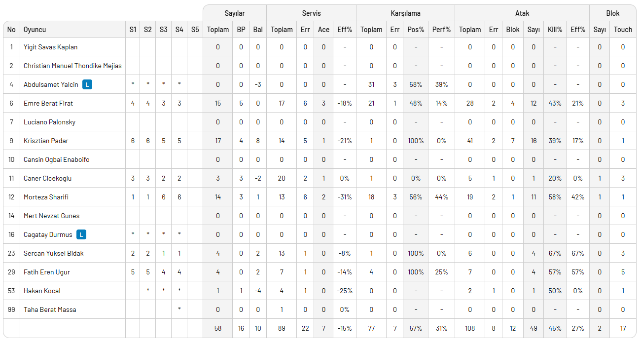 Sarı-lacivertli ekip; 12 blok, 49 hücum ve 7 servis sayısı üreterek galibiyete uzandı. Rakip hatalarından da 33 sayı kazanan Fenerbahçe’de üç oyuncu çift hanelere ulaştı: