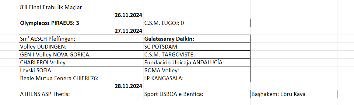 Bu turda Uluslararası Voleybol Hakemlerimizden Ebru Kaya, Athens ASP Thetis - Sport Lisboa e Bengica karşılaşmasında Başhakem olarak görev yapacak.