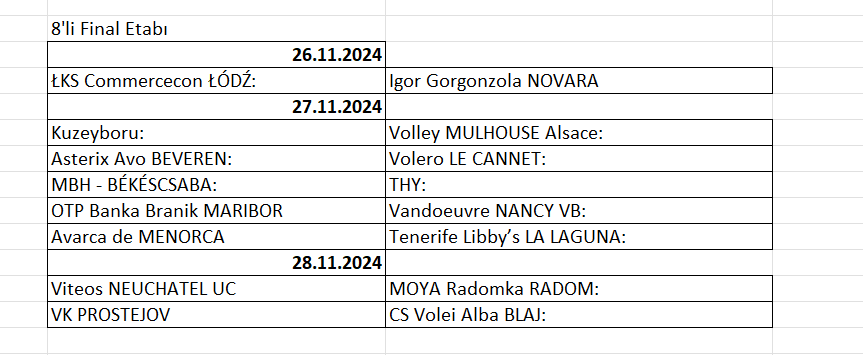Kadınlarda 2025 CEV Cup 8’li Final Etabı maçları 26-28 Kasım tarihlerinde oynanacak. Temsilcilerimizden Kuzeyboru, 8’li final etabındaki rakibi Fransa’nın Volley MULHOUSE Alsace takımı ile ilk maçı Aksaray'da oynayacak. Temsilcimiz THY ise 8’li final etabındaki rakibi Macaristan’ın MBH – BÉKÉSCSABA takımı ile ilk maçını deplasmanda oynayacak. Rövanş maçları 10-12 Aralık 2024 tarihlerinde oynanacak 8'li final etabı ilk maçlarının programı şöyle: