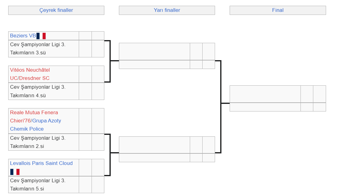 Oynanan maçlarda rakiplerini eleyen iki Fransız takımı BEZIERS VB ve LEVALLOIS PARIS Saint Cloud takımlarının rakipleri CEV Şampiyonlar Ligi'nde play off turundan elenen takımlar olacak.