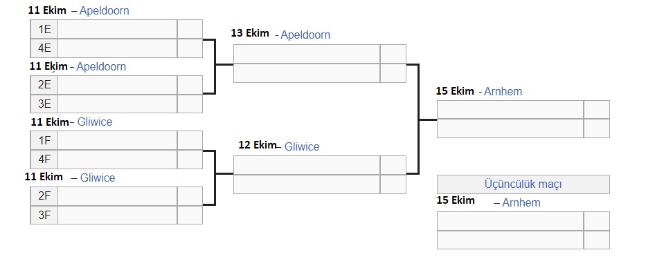 Çeyrek final karşılaşmaları, 8 takımın katılımıyla 11 Ekim'de oynanacak. Çeyrek final ve yarı final aşamasındaki müsabakalar, Hollanda'nın Apeldoorn ve Polonya'nın Gliwice şehirlerinde oynanacak.