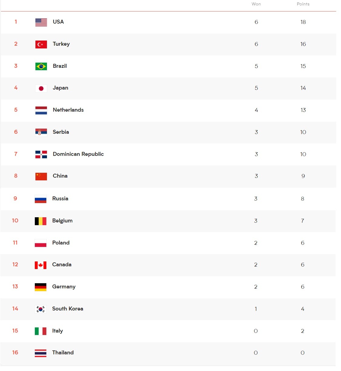 Milletler Ligi’ne son dünya ve Avrupa şampiyonu Sırbistan’ı 3-2 yenerek başlayan ay-yıldızlı ekip, sonrasında ev sahibi İtalya’yı 3-0’la geçti. Üçüncü maçında Polonya’yı 3-1 mağlup eden A Milli Takım , dördüncü müsabakasında Kanada’yı 3-2 ve beşinci müsabakasında Almanya’yı 3-0 mağlup etti. Ay-yıldızlılar, altıncı maçında da son olimpiyat şampiyonu Çin’i 3-0 yenerek 6’da 6 yaptı.