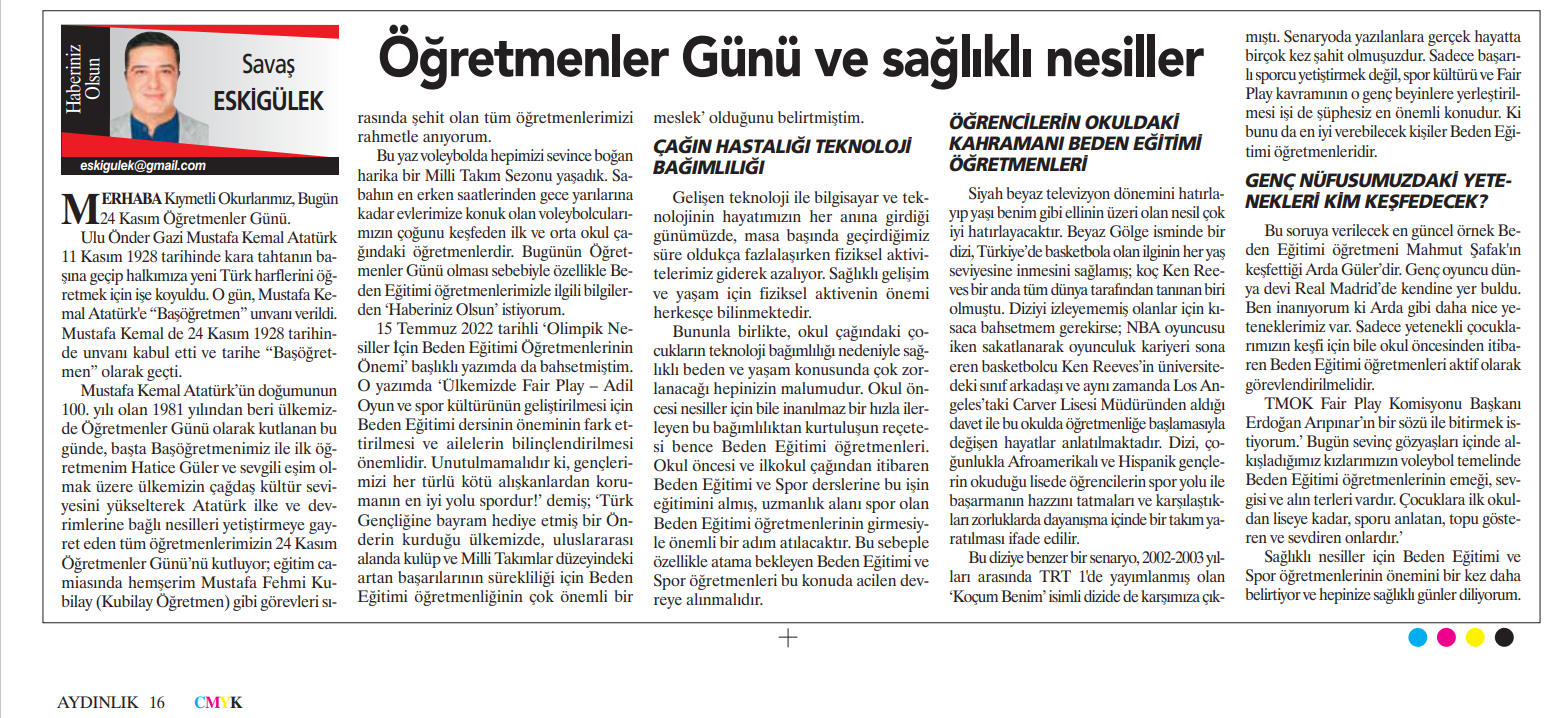 15 Temmuz 2022 tarihli ‘Olimpik Nesiller İçin Beden Eğitimi Öğretmenlerinin Önemi’ başlıklı yazımda da bahsetmiştim. O yazımda ‘Ülkemizde Fair Play – Adil Oyun ve spor kültürünün geliştirilmesi için Beden Eğitimi dersinin öneminin fark ettirilmesi ve ailelerin bilinçlendirilmesi önemlidir. Unutulmamalıdır ki, gençlerimizi her türlü kötü alışkanlardan korumanın en iyi yolu spordur!’ demiş; ‘Türk Gençliğine bayram hediye etmiş bir Önderin kurduğu ülkemizde, uluslararası alanda kulüp ve Milli Takımlar düzeyindeki artan başarılarının sürekliliği için Beden Eğitimi öğretmenliğinin çok önemli bir meslek’ olduğunu belirtmiştim.