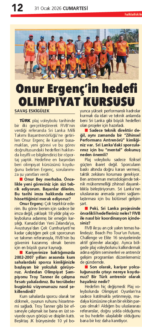 Onur Ergenç’in hedefi olimpiyat kürsüsüTürk plaj voleybolu tarihinde bir ilki gerçekleştirerek FIVB’nin verdiği referansla Sri Lanka Milli Takımı Başantrenörlüğü’ne getirilen Onur Ergenç ile yaptığımız röportaj sizlerle..