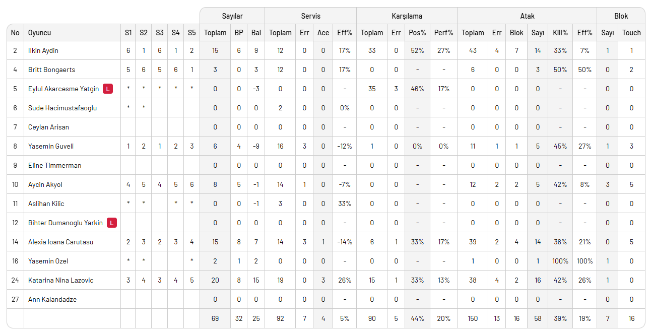 Galatasaray Daikin: Yasemin Güveli, Karutasu, Dangubic, Ayçin, Bongaerts, İlkin, Eylül (L), Aslıhan,