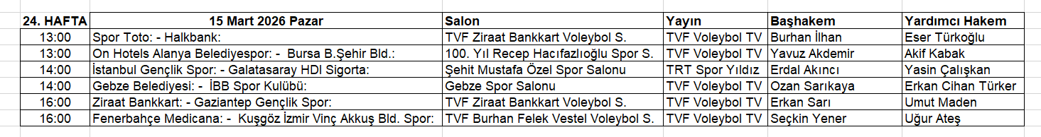 Onur Hoşnut başkanlığındaki Türkiye Voleybol Federasyonu Merkez Hakem ve Gözlemci Kurulu (MHGK), haftanın maçlarında görev yapacak hakemleri açıkladı.Türkiye Voleybol Federasyonu’nun (TVF) resmi internet sitesinde yayımlanan maç programına göre 24. hafta müsabakaları ve canlı yayın bilgileri şöyle