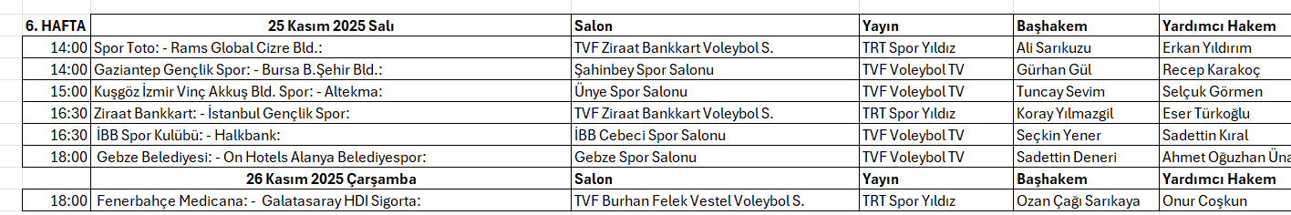 TVF Resmi internet sitesindeki maç programında açıklanan programa göre altıncı hafta maçlarını yönetecek hakemler ve canlı yayın programı şöyle: