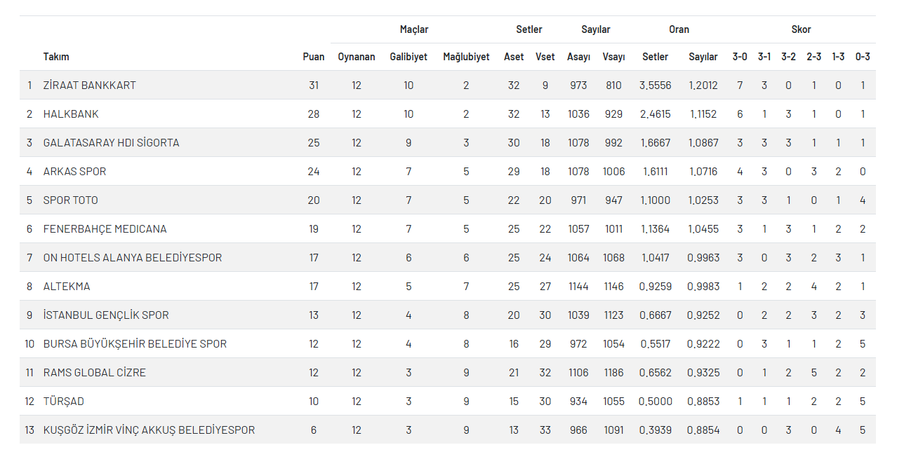 Oynanan maçların ardından Efeler Ligi'nde ilk yarının puan durumu şu şekilde oluştu: