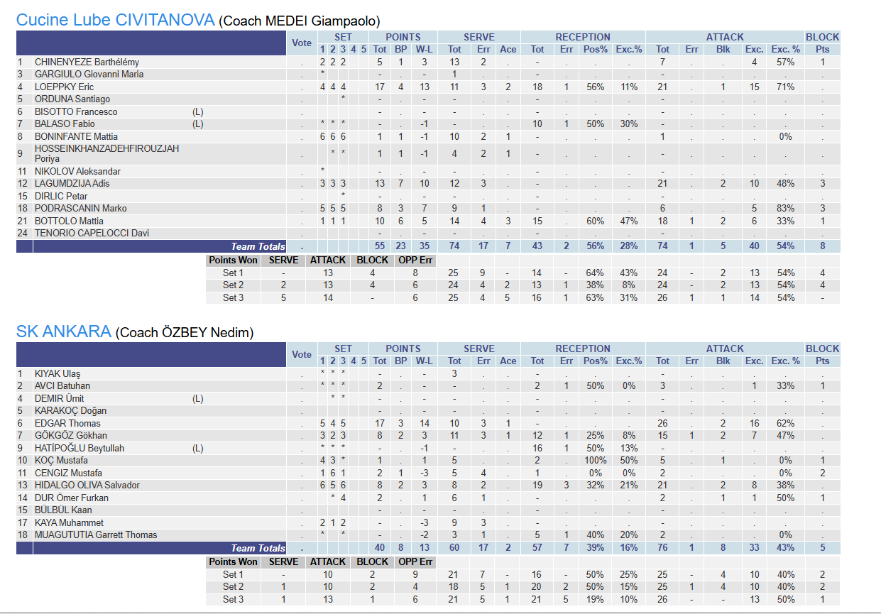 Spor Toto, 2025 CEV Challenge Cup yarı final ilk maçında deplasmanda İtalya'nın Cucine Lube Civitanova takımına 3-0 (25-21, 25-17, 25-21) mağlup oldu. Maçın istatistikleri için tıklayınız. Bu karşılaşmanın rövanşı 25 Şubat'ta Ankara'da oynanacak. Temsilcimiz tur atlayabilmesi için ikinci karşılaşmada öncelikle 3-0 veya 3-1'lik skorla galip gelip ardından oynanacak altın sette rakibine üstünlük kurması gerekecek.
