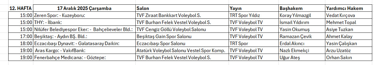 TVF Resmi internet sitesinde açıklanan programa göre 12. hafta maçlarını yönetecek hakemler ve canlı yayın programı şöyle: