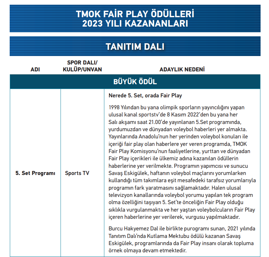 Türkiye'nin olimpik sporlar kanalında Salı akşamları yayınlanan 5.Set programı, Tanıtım Dalında Büyük Ödül'e layık görüldü.