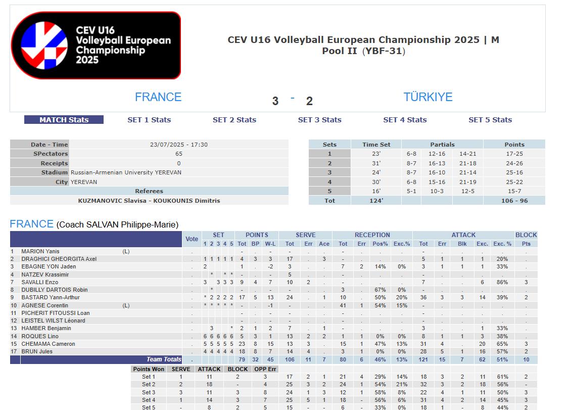 16 Yaş Altı Erkek Milli Takımımız, Ermenistan'da düzenlenen CEV U16 Avrupa Şampiyonası‘ndaki ilk maçında 2-0 öne geçtiği maçta Fransa'ya 3-2 mağlup oldu. Karşılaşmanın setleri 17-25, 24-26, 25-16, 25-22, 15-7 sonuçlandı.