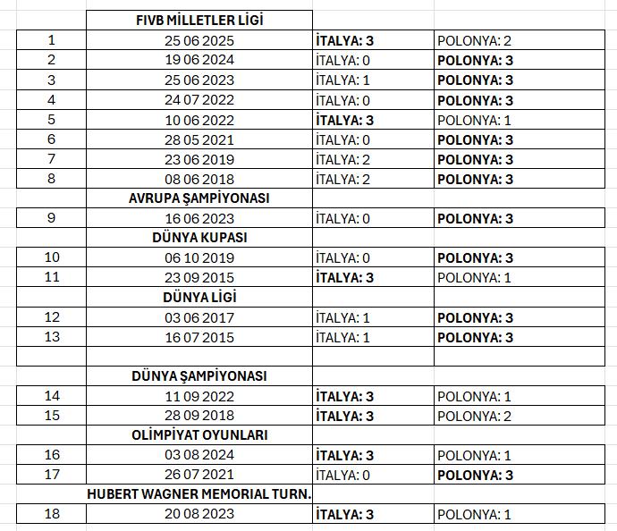 İki takım VNL'de 9. kez karşı karşıya gelecekler. Geride kalan 8 maçta Polonya 6-2 önde bulunuyor.