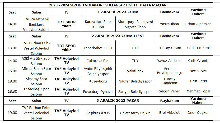 Vodafone Sultanlar Ligi’nde 2023-2024 Sezonu 10.hafta maçları 1-3 Aralık 2023 tarihlerinde oynanacak. Sezonun on birinci haftasında maçları yönetecek hakemler belli oldu. TVF Merkez Hakem ve Gözlemci Kurulu Başkanı Aziz Yener, yaptığı yazılı açıklama ile ligin 11. haftasında görev yapacak hakemleri duyurdu.