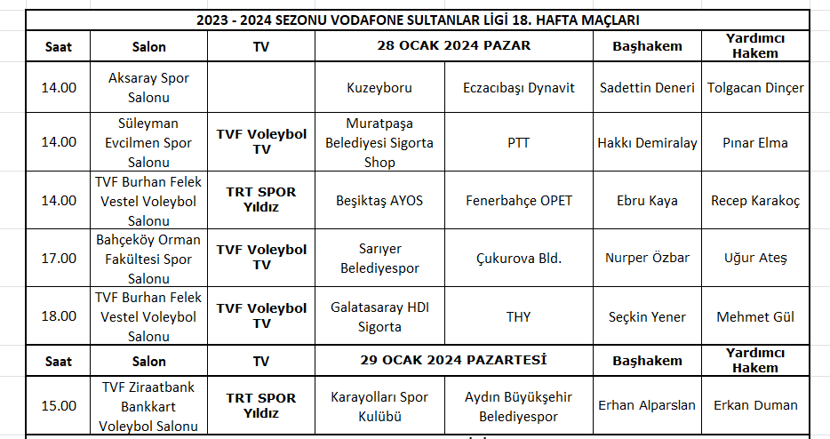 Vodafone Sultanlar Ligi’nde 2023-2024 Sezonu 18.hafta maçları 28-29 Ocak 2024 tarihlerinde oynanacak. MHGK Başkanı Aziz Yener, ligin on sekizinci haftasındaki maçları yönetecek hakemleri açıkladı.