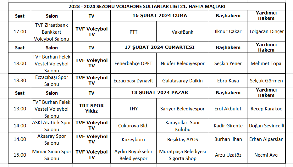 Vodafone Sultanlar Ligi’nde 2023-2024 Sezonu 21.hafta maçları 16-18 Şubat 2024 tarihlerinde oynanacak. MHGK Başkanı Aziz Yener, ligin yirmi birinci haftasındaki maçları yönetecek hakemleri açıkladı.