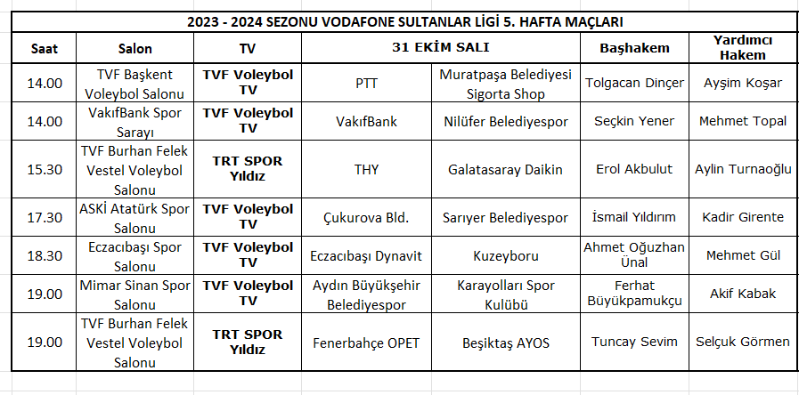 Vodafone Sultanlar Ligi’nde 2023-2024 Sezonu 5. hafta maçları 31 Ekim Salı günü oynanacak. Sezonun beşinci hafta maçlarını yönetecek hakemler belli oldu. TVF Merkez Hakem ve Gözlemci Kurulu Başkanı Aziz Yener, yaptığı yazılı açıklama ile ligin beşinci haftasında görev yapacak hakemleri duyurdu.