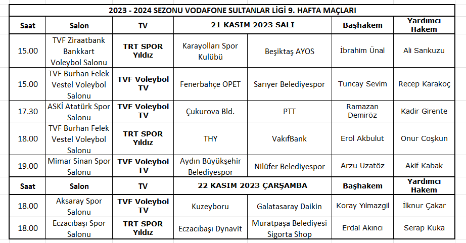 Vodafone Sultanlar Ligi’nde 2023-2024 Sezonu 9.hafta maçları 21-22 Kasım 2023 tarihlerinde oynanacak. Sezonun dokuzuncu haftasında maçları yönetecek hakemler belli oldu. TVF Merkez Hakem ve Gözlemci Kurulu Başkanı Aziz Yener, yaptığı yazılı açıklama ile ligin dokuzuncu haftasında görev yapacak hakemleri duyurdu.