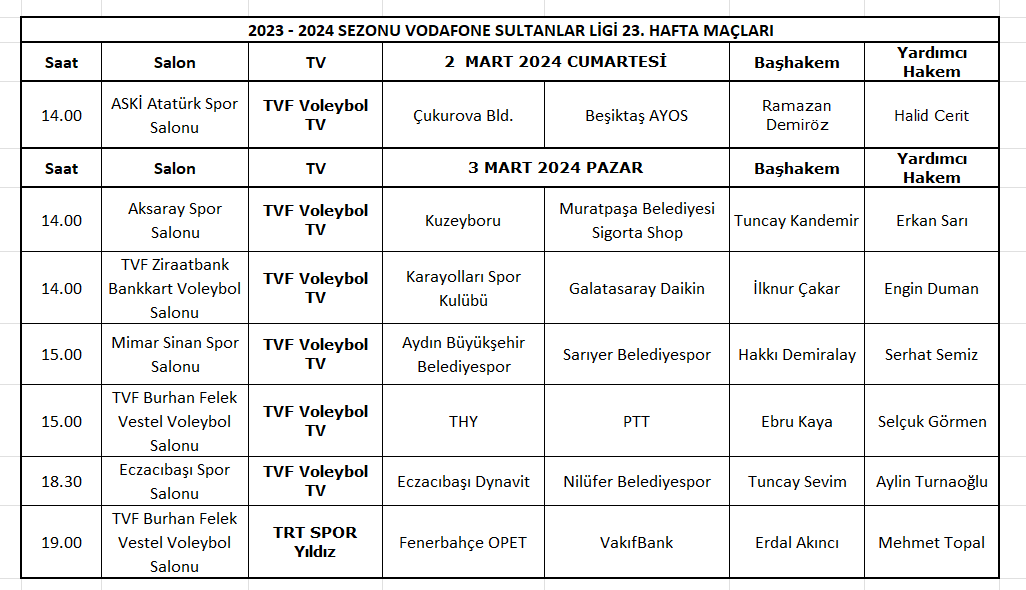 Vodafone Sultanlar Ligi’nde 2023-2024 Sezonu 23.hafta maçları 2-3 Mart 2024 tarihlerinde oynanacak. MHGK Başkanı Aziz Yener, ligin yirmi üçüncü haftasındaki maçları yönetecek hakemleri açıkladı.
