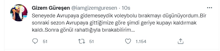 Ancak Misli.com Sultanlar Ligi'de takımı Galatasaray'ın Kuzeyboru'yu yenerek sezonu ilk 6 içinde bitirmesiyle önümüzdeki sezon Avrupa Kupalarında yer alma hakkı elde etmesiyle aldığı kararı değiştirdi. Başarılı kariyerine bir Avrupa Kupası daha eklemek istediğini belirten Gizem Güreşen, sosyal medyada şu paylaşımı yaptı.