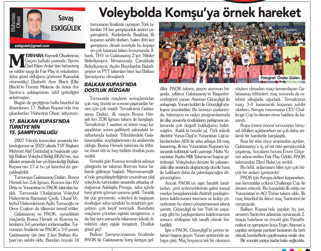 Bugün de geçtiğimiz hafta İstanbul’da düzenlenen 17. Balkan Kupası’nda sonuçlardan bağımsız olarak öne çıkanlardan ‘Haberiniz Olsun’ istiyorum.
