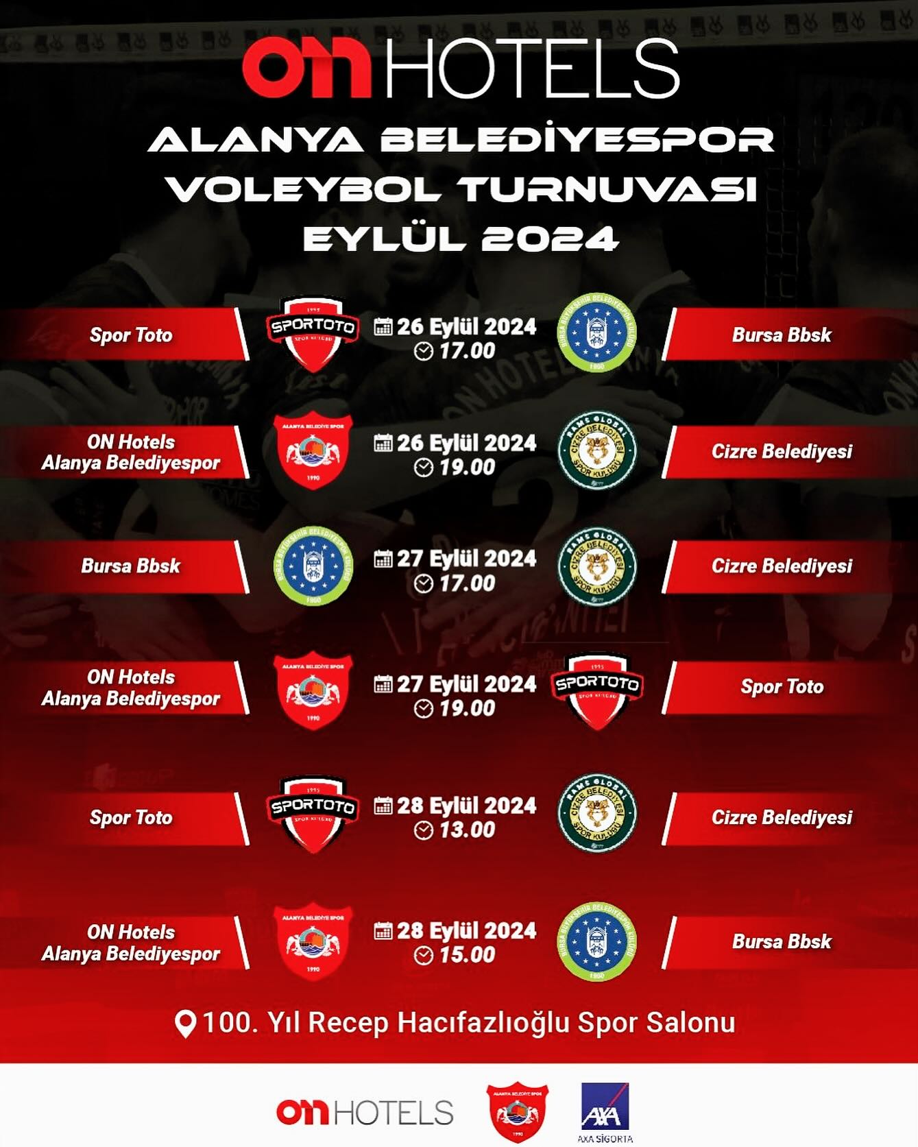 ON HOTEL’S sponsorluğunda, Alanya Belediyespor’un ev sahipliğinde düzenlenecek olan heyecan dolu turnuvada, AXA Sigorta Efeler Ligi’nin güçlü takımları Alanya’da buluşuyor!