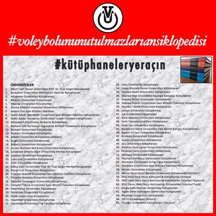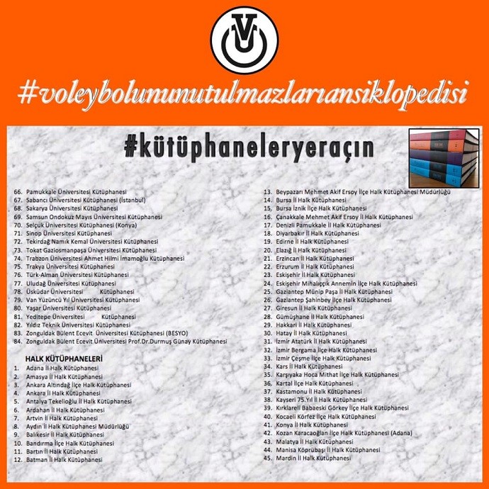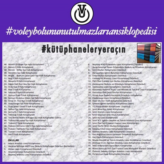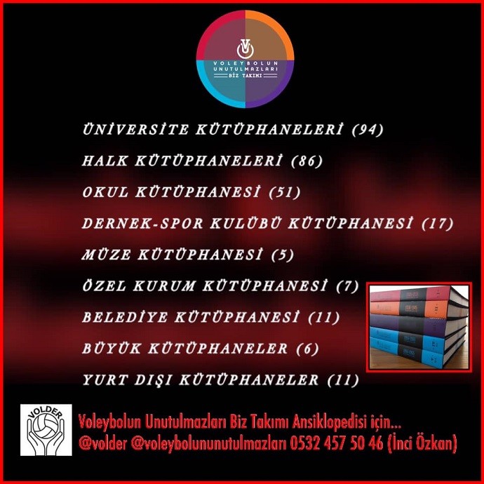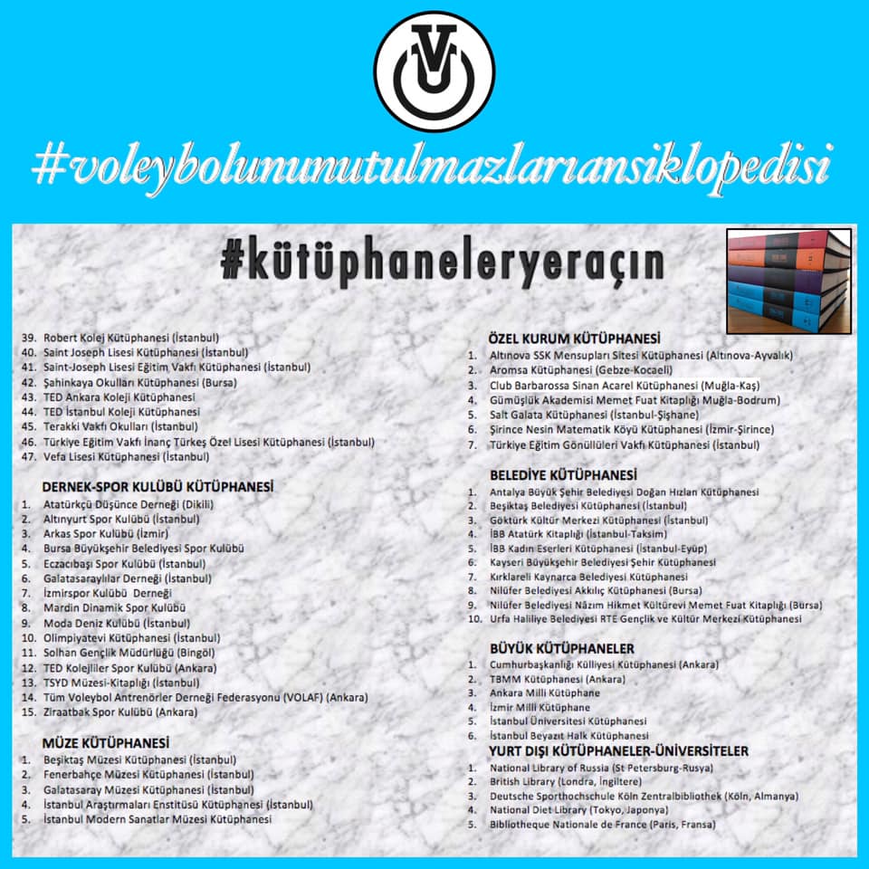 İl, il, ilçe ilçe, okul, okul Türkiye derken, şimdilik sadece Japonya, Rusya ve ABD’de olmak üzere Dünya’da 288 kütüphaneye ulaştı… Bir muhteşem fikir, inanılmaz, büyük bir özveri ile çalışan ekip ve dünyada eşi benzeri olmayan dev bir eser: Voleybolun Unutulmazları Ansiklopedisi 288. kütüphanedeki raflarda yerini aldı. #Kütüphaneleryeraçın diye çıkılan yolda 288. kütüphaneye ulaşıldı… Yurt dışında 11 kütüphanede yer bulan Voleybolun Unutulmazları Ansiklopedisi bakın hangi kütüphanelerde bulunuyor?