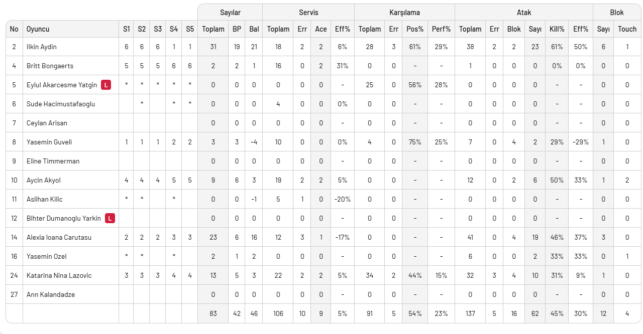 Fenerbahçe Medicana: Fedorovtseva, Aslı, Vargas, Ana Cristina, Dicle Nur, Drca, Gizem (L), Özlem, Meliha, Arelya, Vuchkova, Stysiak,