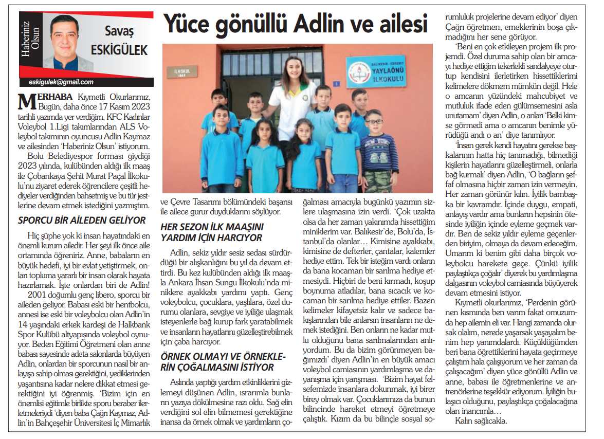 Bugün, daha önce 17 Kasım 2023 tarihli yazımda yer verdiğim, KFC Kadınlar Voleybol 1.Ligi takımlarından ALS Voleybol takımının oyuncusu Adlin Kaymaz ve ailesinden ‘Haberiniz Olsun’ istiyorum.