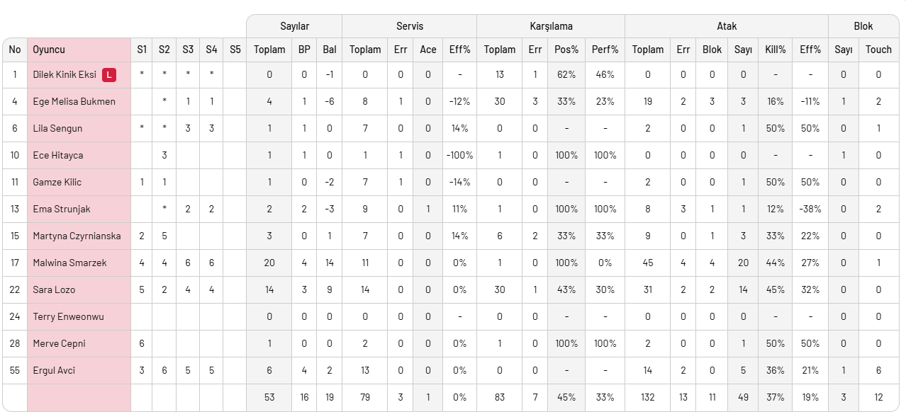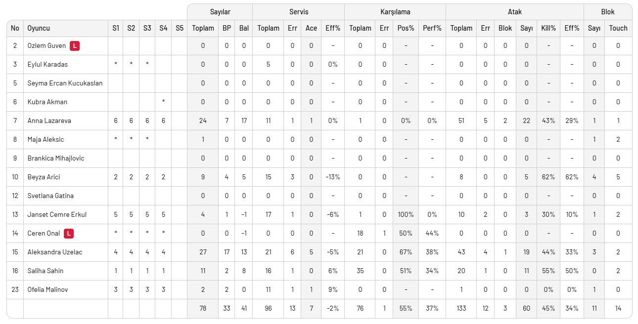 Karşılaşmayı 11 blok, 60 hücum, 7 servis sayısı ile direkt rakip hatasından aldığı 25 sayı ile 3-1 kazanan Zeren Spor'da Uzelac 27, Lazareva 24 sayı ile etkili oldular. Dördü blok olmak üzere Beyza 9 sayı, Saliha 11, Janset 4, Malinov 2, Aleksic 1 sayı ile 3 puan getiren isimler oldular.