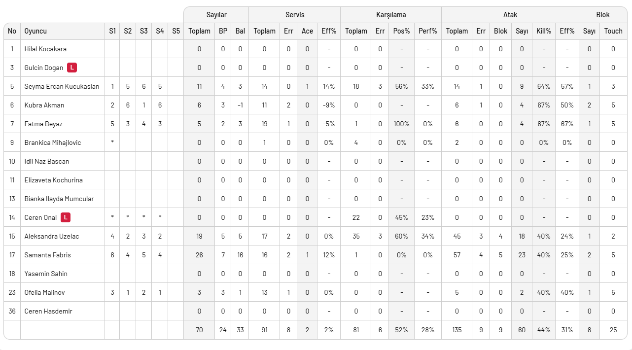 Zeren Spor: Şeyma, Kübra, Malinov, Uzelac, Fatma, Fabris, Ceren (L), Mihajlovic,