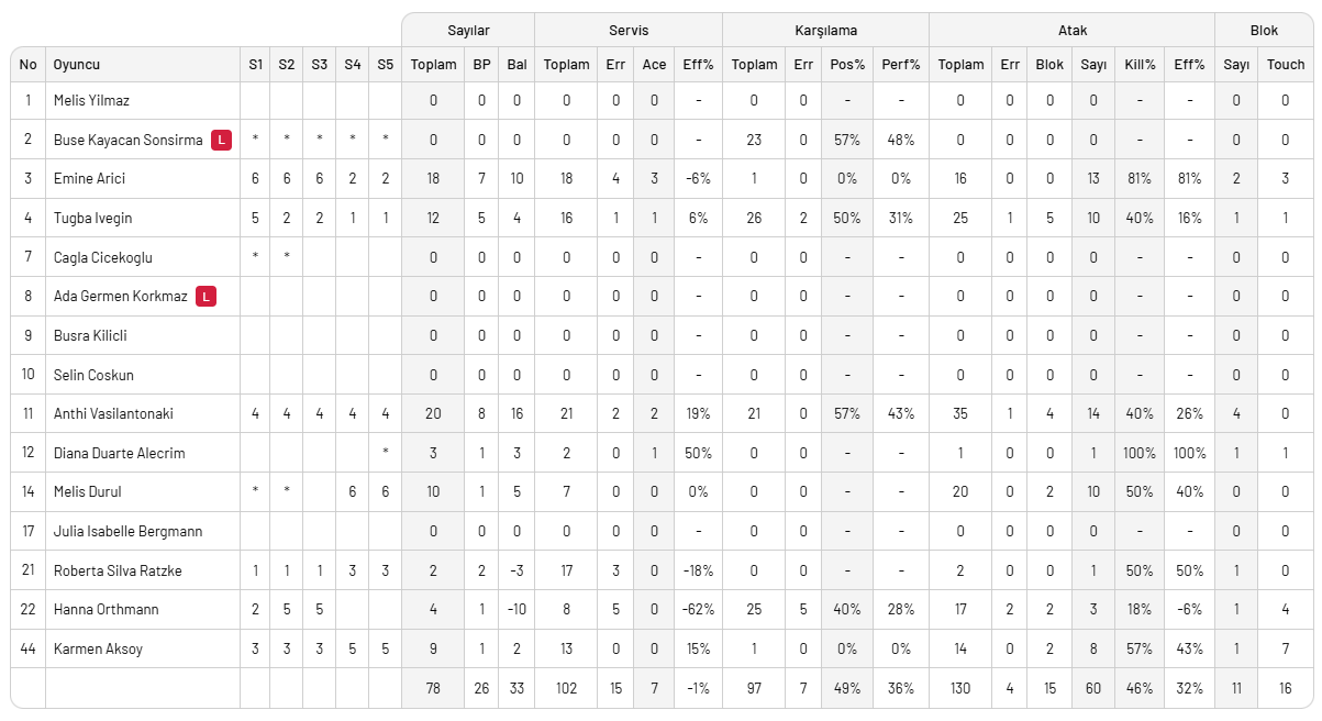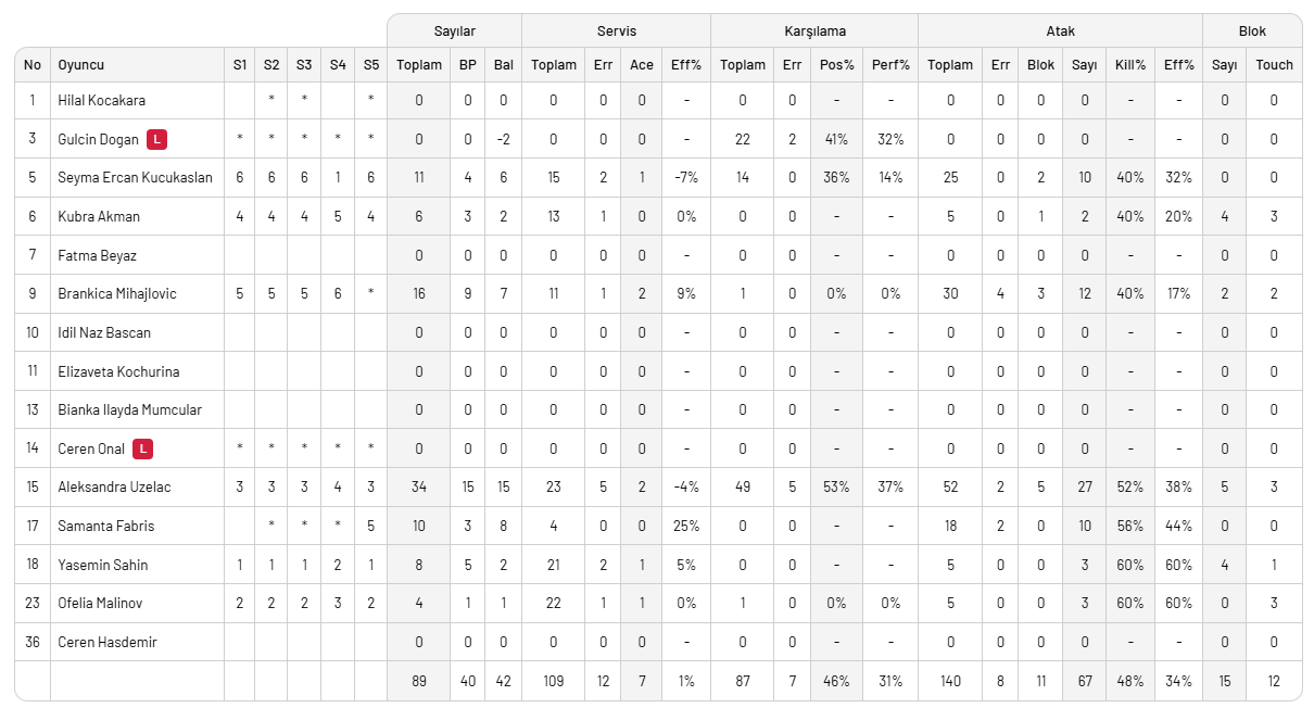 Zeren Spor: Yasemin, Malinov, Uzelac, Kübra, Mihajlovic, Şeyma, Gülçin (L), Ceren (L), Hilal, Fabris, Mihajlovic,
