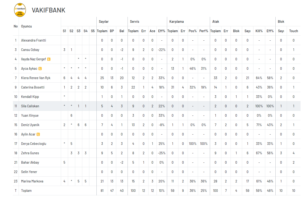 VakıfBank: Bosetti, Deniz, Cansu, Markova, Bahar, Van Ryk, Ayça (L), Sıla, Kipp, Zehra, Yuan Xinyue, İlayda,