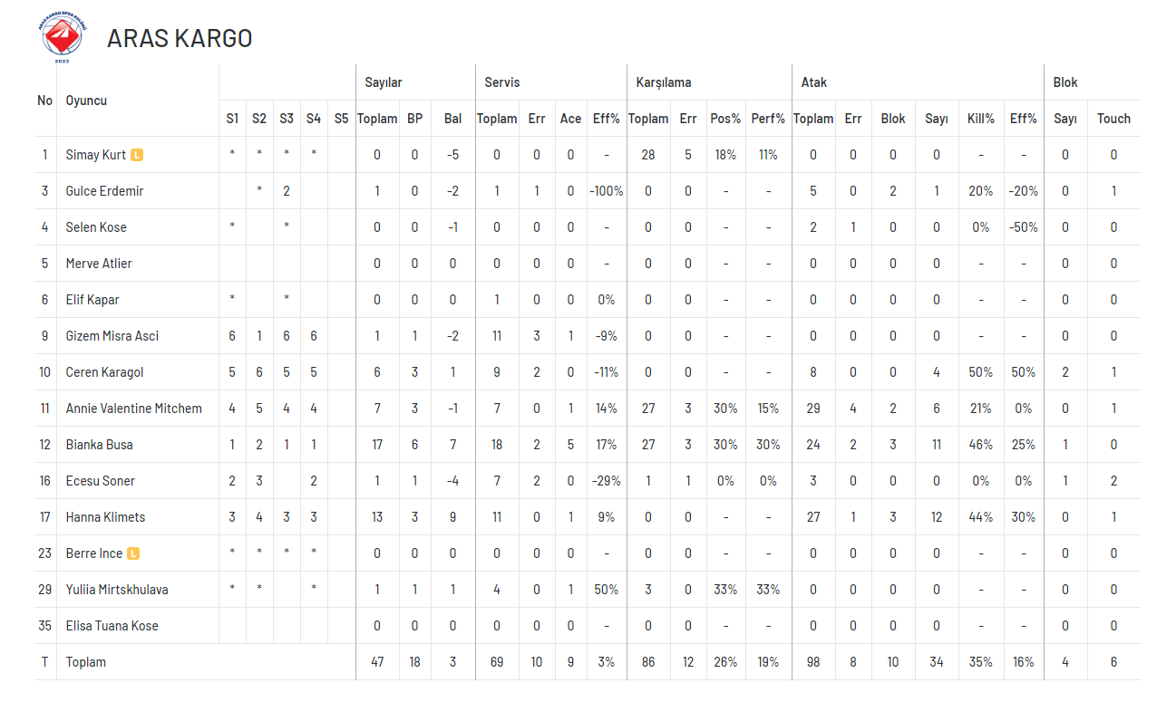 Aras Kargo: Busa, Ecesu, Klimets, Mitchem, Ceren, Gizem Mısra, Berre (L), Simay (L), Mirtskhulava, Selen, Elif, Gülce,