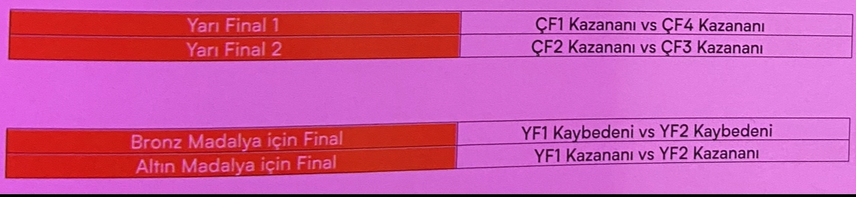 Çeyrek final maçını kaybeden ekipler eleme etabındaki puanlamaya göre 5. ve 8.'lik arasında sıralanacaklar.
