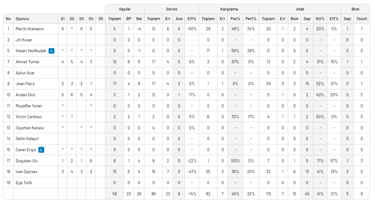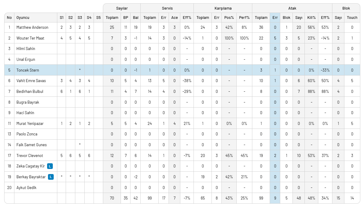 Ziraat Bankkart: Murat, Anderson, Vahit Emre, Ter Maat, Clevenot, Bedirhan, Berkay (L), Faik Samet,