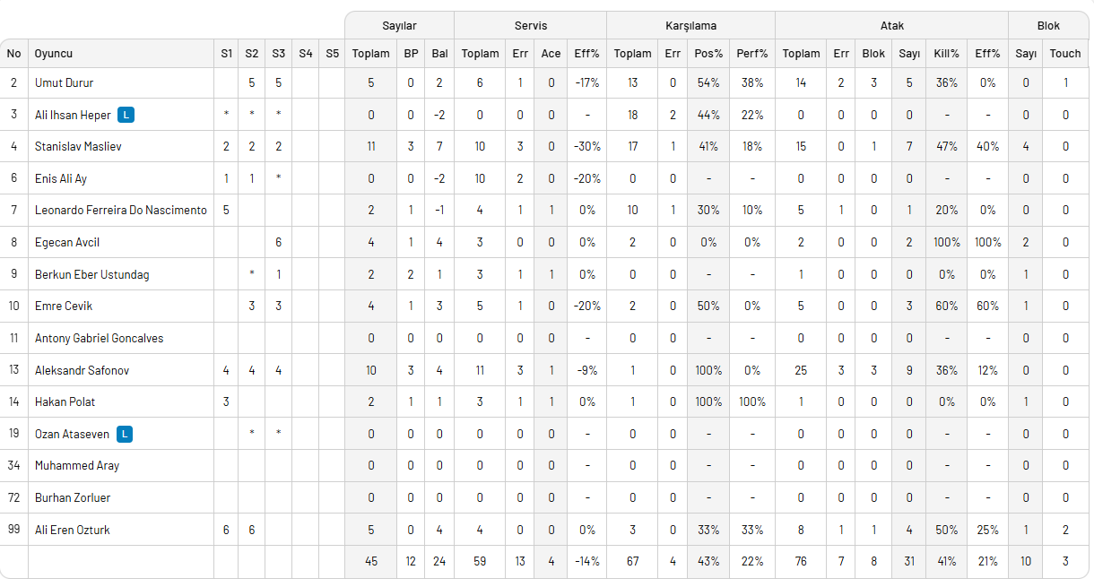 ARKAS SPOR: Eduardo Carisio, Burutay Subaşı, Burakhan Tosun, Gyorge Grozer, Gökçen Yüksel, Ertuğrul Gazi Metin (Julien Zenger, Emir Kaan Öztürk, Melih Sıratça, Ulaş Onur Topbaşlı)