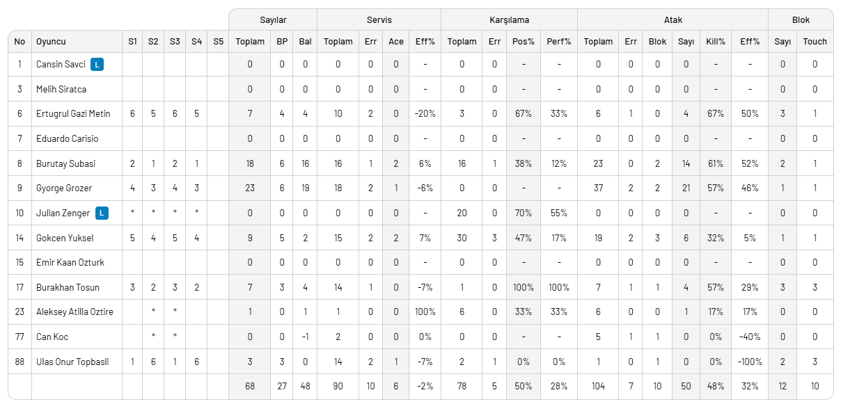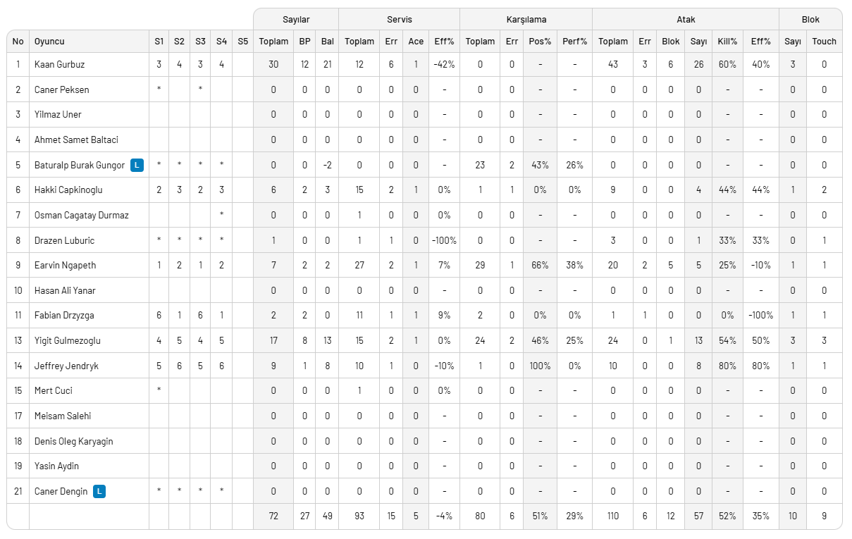 Arkas Spor: Ulaş Onur, Burutay, Burakhan, Grozer, Gökcen, Ertuğrul Gazi, Zenger (L), Atilla, Can,