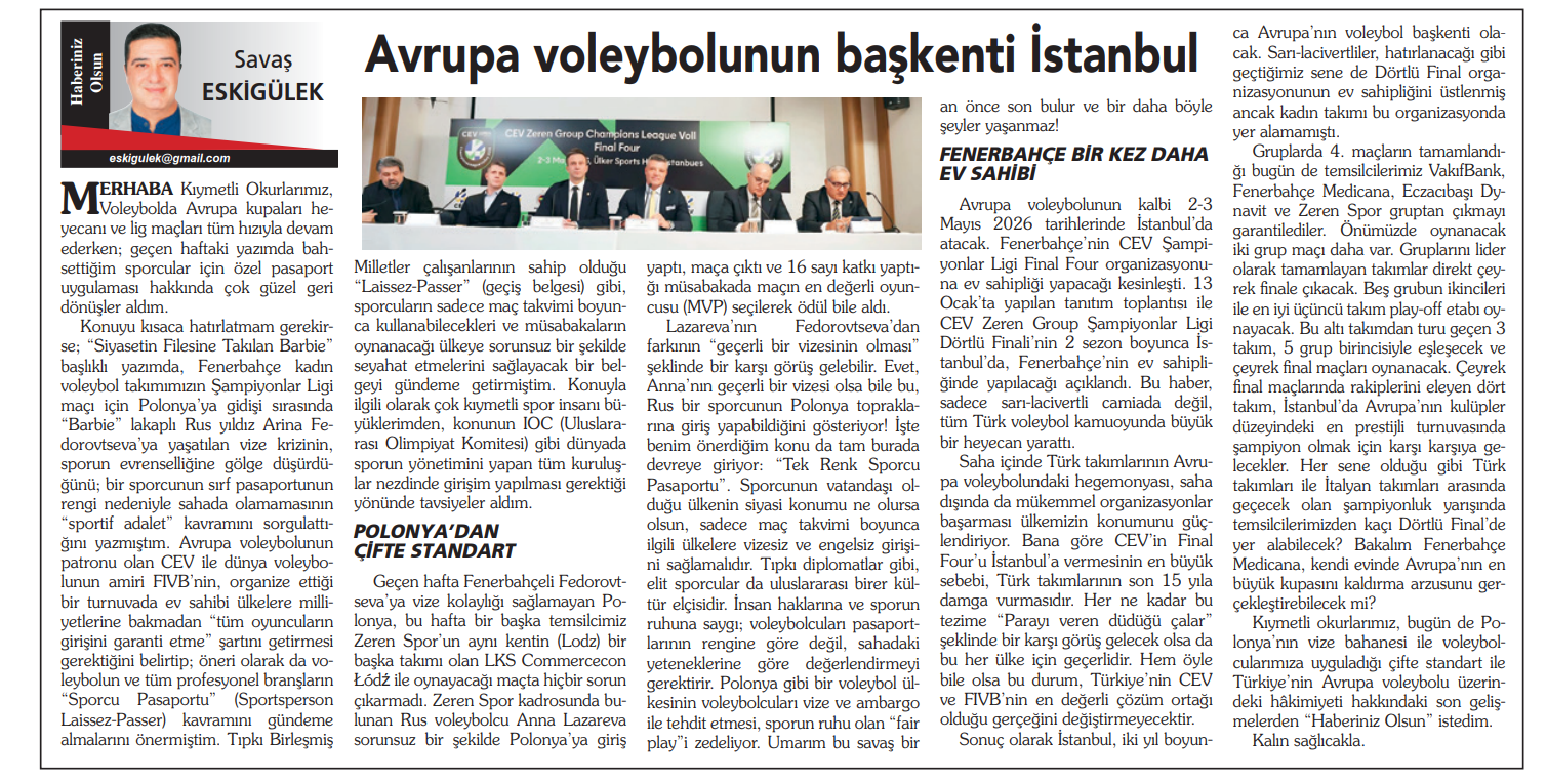 Voleybolda Avrupa kupaları heyecanı ve lig maçları tüm hızıyla devam ederken; geçen haftaki yazımda bahsettiğim sporcular için özel pasaport uygulaması hakkında çok güzel geri dönüşler aldım.