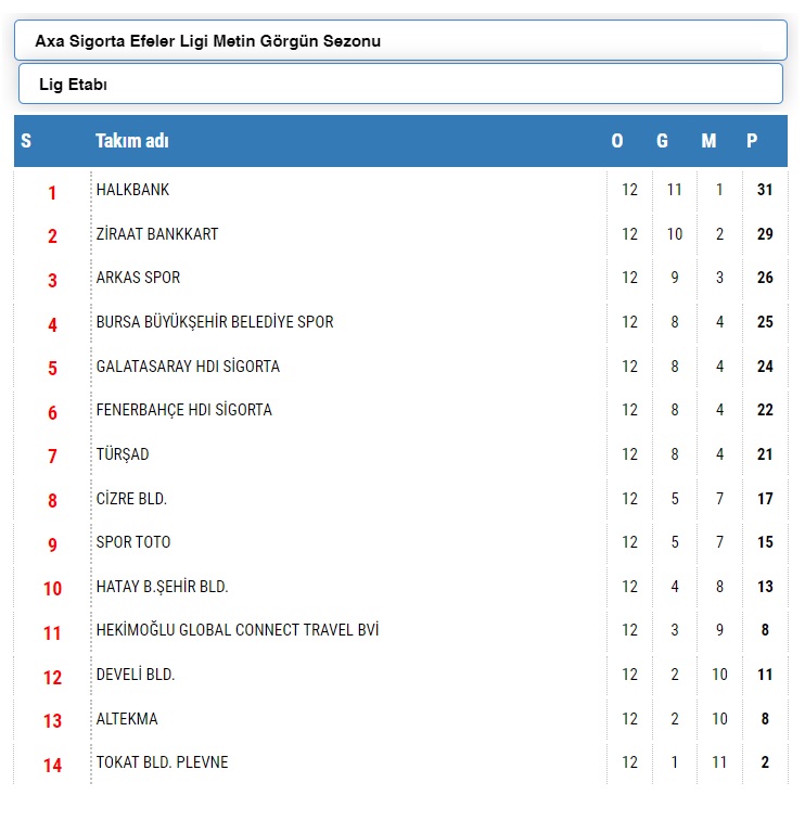AXA Sigorta Efeler Ligi Metin Görgün Sezonu’nda 12. hafta, 10 Aralık Cumartesi günü oynanan 4 karşılaşmayla sona erdi. Günün sonuçları şu şekilde: