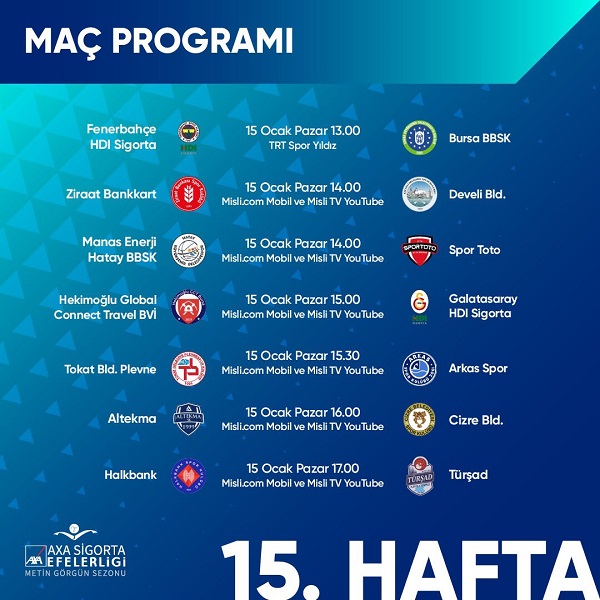 AXA Sigorta Efeler Ligi Metin Görgün Sezonu'nda 15. hafta karşılaşmaları 15 Ocak Pazar günü oynanacak. Haftanın maçlarında görev yapacak hakemleri öğrenmek için tıklayınız. Ligde 15. haftanın maç programı ise şöyle: