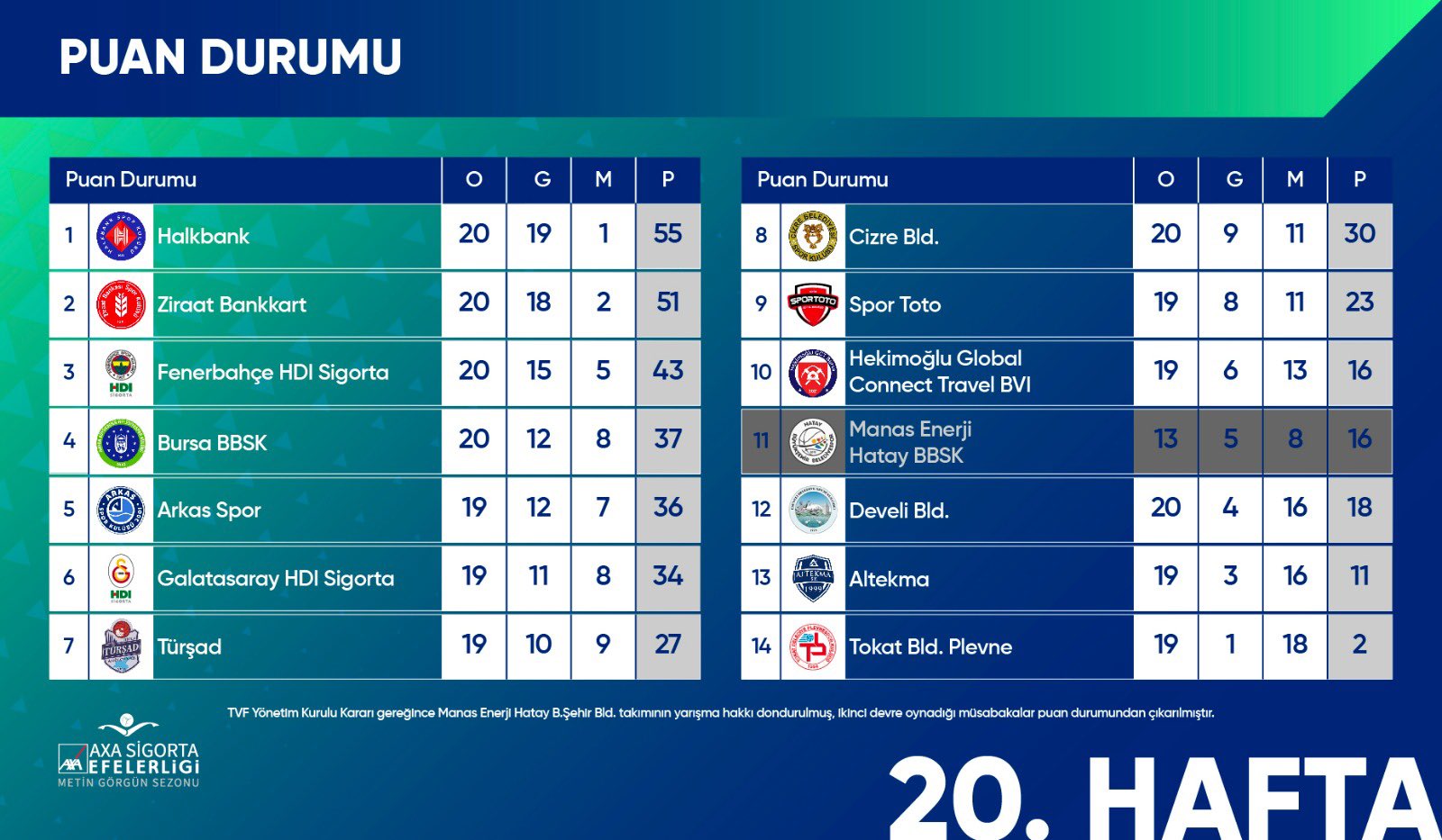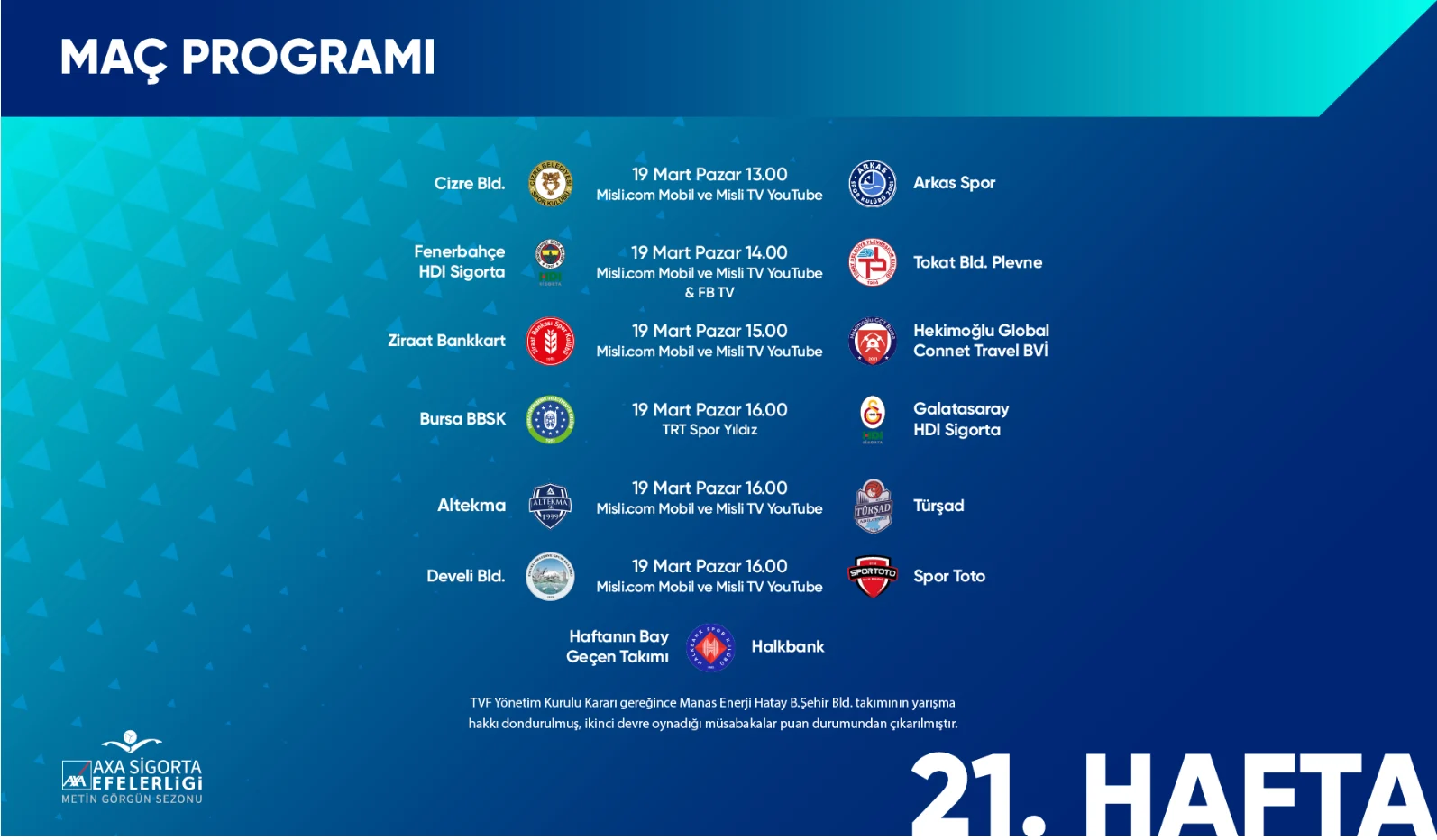 AXA Sigorta Efeler Ligi Metin Görgün Sezonu’nda 21. hafta karşılaşmaları 19 Mart Pazar günü oynanacak.
