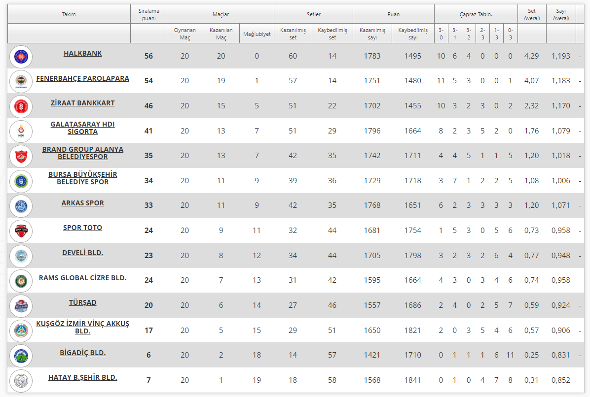 AXA Sigorta Efeler Ligi’nde 20.hafta 18 Şubat Pazar günü oynanan Bigadiç Bld.-Develi Bld. karşılaşmasıyla sona erdi. Haftanın kapanış mücadelesini kazanan taraf 3-0’lık (25-21, 25-22, 25-20) skorla konuk Develi Bld. oldu. İstatistikler için tıklayınız. Oynanan maçların ardından ligde puan durumu şu şekilde oluştu: