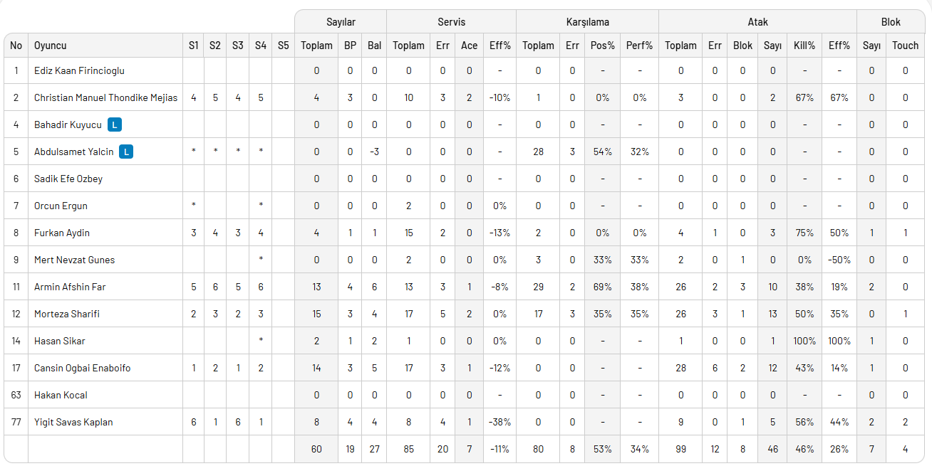 Halkbank'ta Leal 25, sayı ile maçın en skroer ismi oldu. Dick Kooy 15, Mirza 11 sayı ile etkili oldular. İstanbul Gençlik Spor'da ise Sharifi 15, Cansın 14, Afshin 13 sayı ile oynadılar.