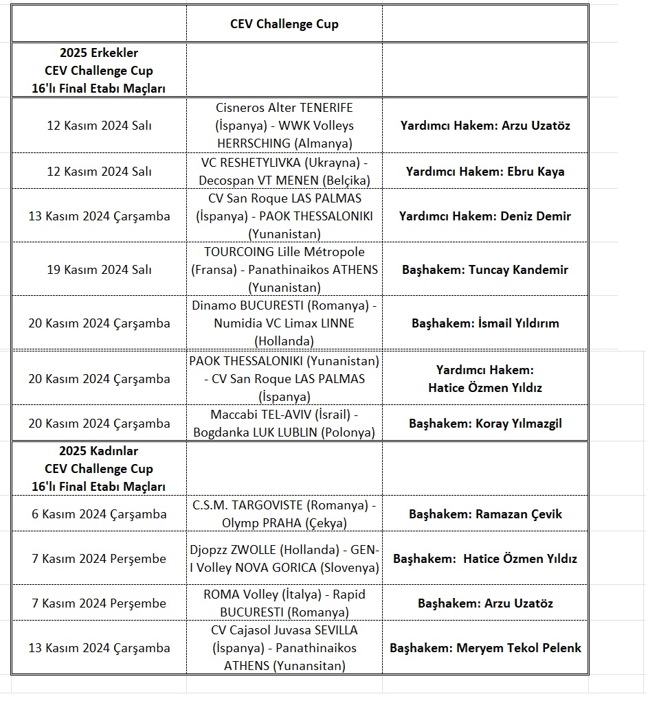 Avrupa Voleybol Konfederasyonu (CEV), 17 Uluslararası Voleybol Hakemimize Kasım ayında oynanacak CEV Şampiyonlar Ligi , CEV Cup ve CEV Challenge Cup'ta oynanacak 21 karşılaşmalarda görev verdi. Kasım ayında oynanacak Avrupa Kupası maçlarında görev yapacak hakemlerimizin maçlarına ait bilgiler aşağıdadır. Ülkemizi Avrupa salonlarında temsil eden tüm hakemlerimize başarılar dileriz. Voleybol Aktüel