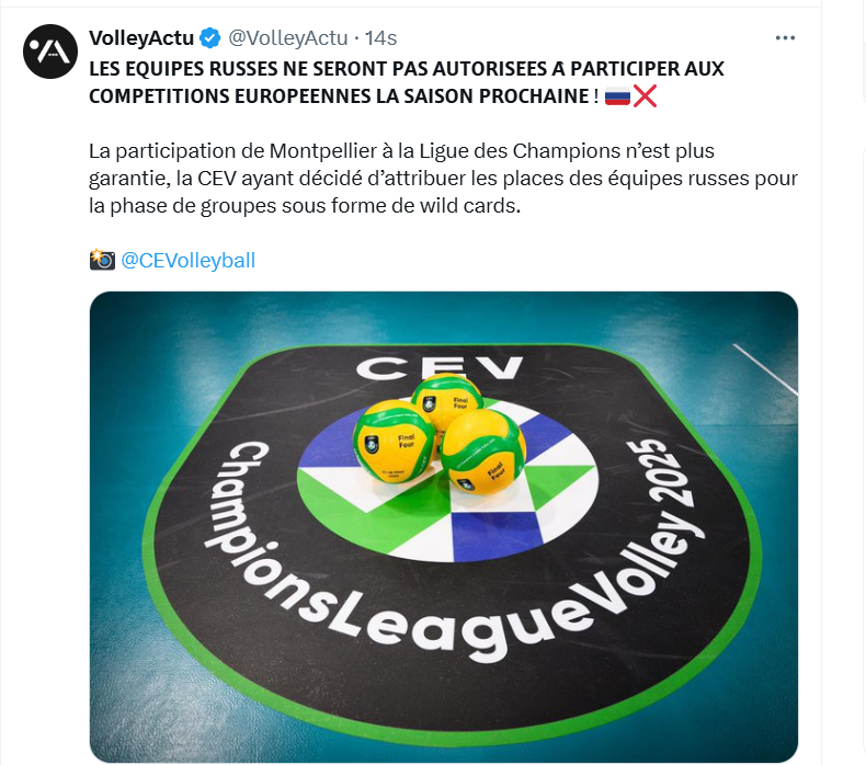 Avrupa Voleybol Konfederasyonu (CEV), Rus takımlarının gelecek sezon Avrupa yarışmalarına katılmasına izin vermeyecek. VolleyActu'nun paylaşımına göre CEV, önümüzdeki sezon Rus takımlarının yerlerine Wild Card ile yeni takımları davet edecek. CEV, Kadınlarda 4, erkeklerde ise 3 Wild Card vererek Rus takımlarının yerlerini dolduracak.