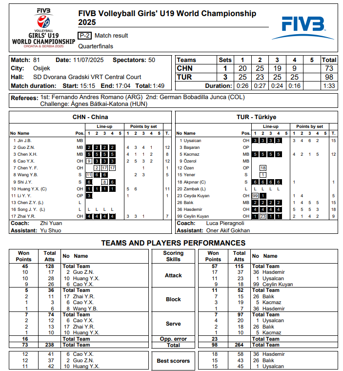19 Yaş Altı Kadın Voleybol Milli Takımımız, Hırvatistan'ın Osijek kentinde devam eden 2025 FIVB U19 Kadınlar Dünya Şampiyonası çeyrek finalinde Çin'le karşılaştı. İlk seti kazanan Milli Takımımız skoru 1-1 olmasını engellemedi. Ancak arka arkaya aldığı iki setle maçı 3-1 kazanan U19 kadın Milli Takımımız adını yarı finalde yazdırdı. Karşılaşmanın setleri 20-25, 25-23, 19-25, 9-25 sonuçlandı.